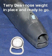 Going back, I realized that I'd left out two things. One was the landing light (no problem as I'll replace it with an MV lens). The other was the 'stuff' that fits behind the cockpit. Fortunately, it wasn't a major problem to insert it from the wing opening and it clicked in place. Then I sanded down the fuselage seam and found only a few areas that needed filler; most of them where there were sprue gates. The Terry Dean weighted nose was then glued in place. Some sanding/filler is needed here as well for the nose is not precisely the same size as the opening.
