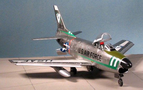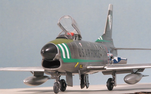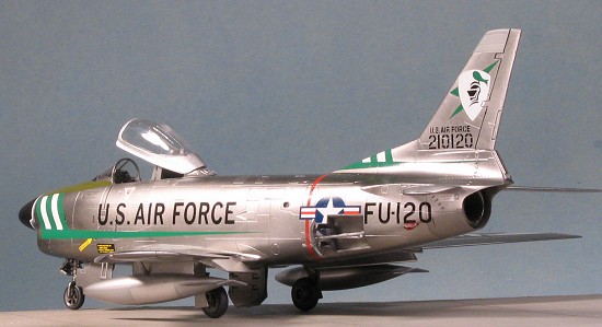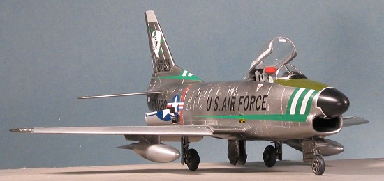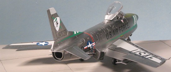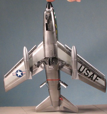 The wings were then glued in place with only a teeny bit of filler needed in the front. I have not seen too many F-86Ds with the weapons tray down so that was not installed, neat though it looks. Once the wings were in place, then I sanded off the trademark from the flap and glued those in place. The tail planes are an easy fit and with that, I had a pretty complete airframe. The next step was to attach the main and nose gear. I glued on the windscreen, masked it and the canopy, filled in the cockpit and it was time to paint.