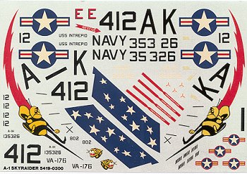 I'll not go into how good the instructions are as most of you already know. The markings available are for two planes. One is the box top plane from VA-176 in light gull grey over white and the other is for one from the South Vietnamese Air Force in the SEA scheme of FS30219, 34102 and 34079 uppers. The instructions state the underside is white and while that is quite possible (these being overpainted Navy planes), it is also possible for it to be FS 36622. The front of the cowling and the cowl flaps are light gull grey, leading credence to the white underside deal. The decals themselves look quite good and are semi-matte so they could very well work as advertised. Included are some 'remove before flight' tags for you to use on some of the bombs.