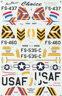 The decals are basically a full size Aeromaster sheet with markings for three aircraft: First is the box art plane 'Night Take-off', the commander's aircraft from the 58th FBW. Next is an 8 FBS/49 FBW plane with the yellow and black fin/stab/wing tank stripes. Finally, a yellow-trimmed 430 FBS Thunderjet. All are from the Korean War era.