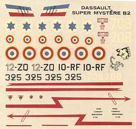 Instructions provide a good building sequence with nicely drawn diagrams. Color info is saved for the decal and marking section where it gives both interior and exterior color data. Paint info is in Humbrol numbers and generic names. There are markings for four aircraft; two French and two Israeli. For the French, there is the box art plane from EC 10 in bare metal with the tricolor rudder and bold fuselage flash. There is also an EC 12 scheme in the pseudo-SEA camo scheme it wore in its last years. For the Israelis there is the bare metal delivery scheme and the three color desert scheme. This later scheme is the one used prior to adding the Skyhawk engines to them. Though the decals are old, they are well printed and may still be usable.