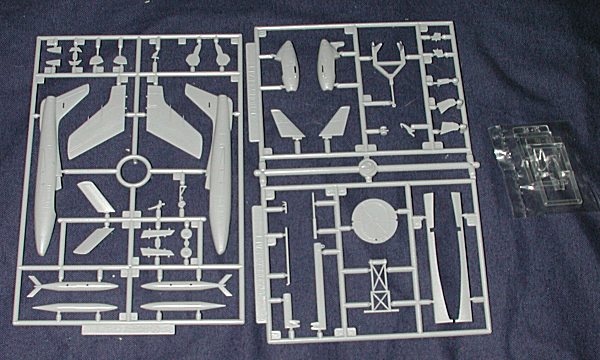 What you have here is your basic Hobbycraft B-36 minus some bits and with a few added on. What is missing are the gun turrets that were on the earlier bomber versions of this kit. What is new with this kit from the first one are the jet engines and pods. The bits different from the other two releases are the F-84K, XF-85 and trapeze mechanism. Down side is that unless you build the kit wheels up, you can't extend the trapeze. Unfortunately, no display stand is provided so you are sort of out of luck right from the box. You can do this kit wheels down with the aircraft snuggled into the bomb bay, but that sort of defeats most of the cool of this boxing. If you do build it wheels down, make sure you fill the nose with as much weight as you can stuff in there. The kit instructions don't even mention weights, but I'll bet it is a heck of a tail-sitter without it!