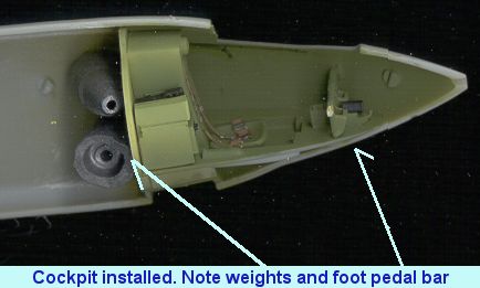 Ok, now on to real construction. First pieces glued together were the backwall, nose gear well (yep that vertical thingy is the nose gear well!), and thenose gear attachment panel. Then the interior floor was glued on, and thisassembly was then set into the nose section to make sure all the bits wereproperly aligned. Lucked out and they were! Various resin bits and pieces werethen glued to the cockpit assembly. The whole thing was then painted US interiorgreen using Aeromaster acrylic. The interior of the fuselage was also paintedthis color as were the wheel wells.