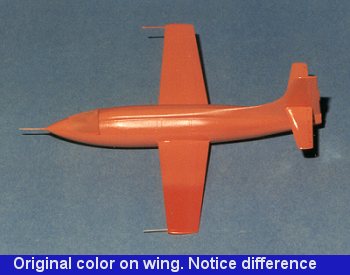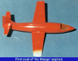 Notreally sure if this should be the final shade, so I thought about it a lot andlooked at more images of the first X-1. While that was going on, I also added afew more external bits to the kit, such as the nose and wing probes. The plasticbreaks a lot easier than I would wish as I broke one of the wing probes. Tookthis time to repair a few glitches in the paint as well. Finally deciding thatit should be lighter, I mixed in some white with the orange paint to get a morepastel look to it.