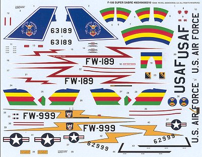 Markings for two aircraftare provided. One is the box top aircraft, a plane from the 31 TFW FighterWeapons Team when these guys were based at George AFB. All the appropriatelygaudy markings are provided on the sheet. The other is from the 79 TFS/ 20 TFWfrom Woodbridge in the UK. These markings are predominately yellow and you willhave to paint on the tail and wing/stab markings.