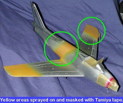 Getting back into the kit, I first removed as much of the fuselage decal as I could. Then these areas were painted white, as was the nose. The nose was then painted red and when dry, masked off. Then the other areas received a coat of yellow. I used Testors Model Master enamels for these colors. Knowing how Alclad II reacts with enamels unless one is very careful, the areas that were painted were given a coat of clear acrylic gloss when dry.