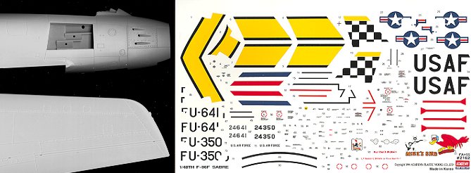 Academy's kit is inlight grey plastic with superb engraved detailing. It comes with two pilotfigures, one standing and one sitting, a full engine, openable gun bayswith guns, positionable speedbrakes, two styles of drop tanks, and an innerpylon with bombs. Also included are Sidewinder missiles and rails. Though theseare not applicable to the Korean War versions, they would be if doing aLuftwaffe or Taiwanese Sabre. Should you decide to display the kit with theengine showing, you need to cut the fuselage. There is also a trolley forholding the rear fuselage half.