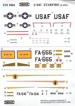 Emhar's kit of the F-94C is noweight years old. It is molded in flash free grey plastic with engraved panellines. In many ways, it is quite reminiscent of an improved Frog kit in that itis relatively basic and appears to be pretty easy to build. There are nooptional parts other than decals. Parts in general are good, though it isobvious that you are not buying a Hasegawa kit. The cockpit has a tub, twoinstrument panels and two seats that are themselves a five-piece construct.