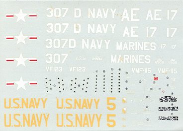 The instructions are more than adequate, showing construction in 6 steps. There is no interior painting information so you are on your own regarding that. Decals are the same as the normal Hasegawa kit and offer markings for three aircraft. One is from VF-123 with yellow wing tip and rudder markings. Next is a VMF-115 plane which is shown on the box top along with the VF-123 plane. Finally a Blue Angels aircraft. The Scalemaster decal sheet is generally superior to the Hasegawa kit decals, however, even back 15 or more years ago, registration was a problem as the red is off register enough to make those decals unusable.