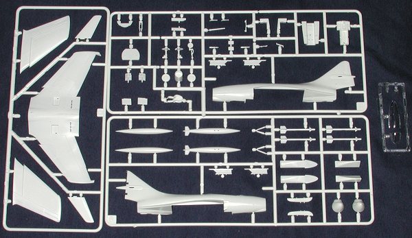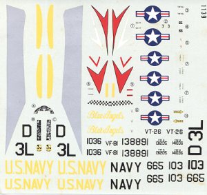 This kit is very similar to the previous Panther kit in terms of what the kit is like and what is offered. It has engraved panel lines, two position speed brakes and cockpit and the ability to carry underwing ordnance. In this case it is a combination of wing tanks and Sidewinder missiles. The cockpit is identical with seat, stick and instrument panel. Decals are provided for instruments and you get a pilot should you wish to use it. Instructions are also the same with six construction steps, though there is some color information for the interior and other parts. FS 595a colors are given in those cases. You get three different decal options. One is a Blue Angels aircraft, and for this you get a standard nose. For the others, a later nose with refueling probe is provided. A gull grey and white Cougar from VF-81 is provided as in a training TAF-9 from VT-86. This plane is in white with international orange sections on it. It makes into a very colorful model, but bleed-through of the orange is a real problem when it comes to decals. The decals provided in this boxing are the same subjects as what is in the Hasegawa kit. There is no indication of who does these decals, but they are crisp and in register.