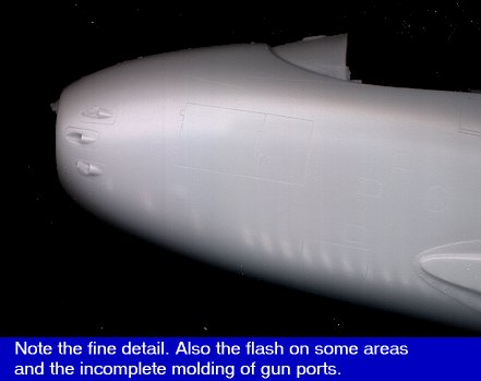 One of the first things that I noticed were that the wings were warped. Nota major problem, but one that needs attention. Imagine it is because of the size of the parts. No other Czech Model kit has parts of this size and they do a very good job of carrying out the molding, but still the wings are warped. Also noted were flash on many of the edges and some parts had incomplete molding. This was most noticeable on the fuselage where three of the six-gun ports were plugged and a couple of the intakes on the side were also plugged. It just means more work for the modeler to clean up these areas; the fuselage intakes being particularly difficult to dig out and smooth as they are of a slit type.