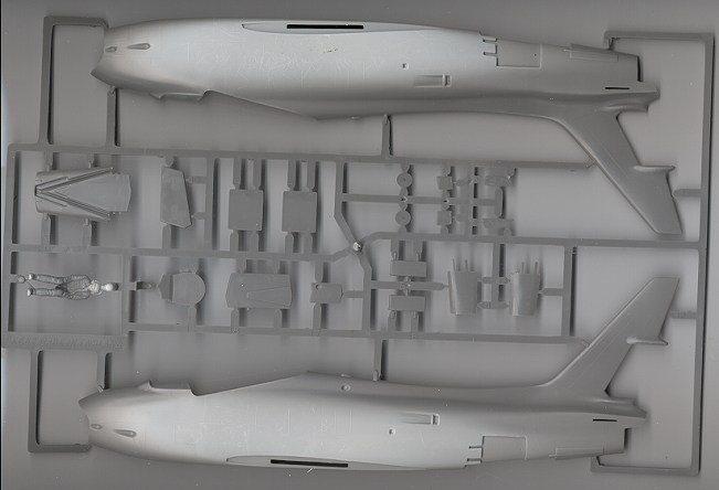 Cockpit consists of a seat and instrument panel(no decal, minimal detail). There is a pilot figure to fill the space. A nicetouch is a full intake trunk, but good luck filling the seam! There is no wheelwell detail. The wings can be folded, but there is no detail in the foldsection. The tail hook can be positioned up or down. The rudder is a separatepiece. There are three pylons for each wing that fit into a slot already openedfor you. Underwing stuff consists of two Sidewinders and a drop tank per wing.The missiles are just shapes and best replaced from a Hasegawa Weapons set. Thecanopy is separate and can be displayed open if desired. There is also an in-flightrefueling probe. I know this doesn't sound very exciting, but frankly,there isn't much to get excited about as the kit is really pretty mediocre,despite the subject.