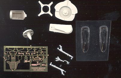 Now let's take a closer look at those ingredients. The plastic bits have fairly good detailing. It is all engraved and though a bit 'soft', not out of character for a low production, low-pressure molded kit. The surface of all the plastic parts has a rough, pebbly texture. Since this is a bare metal plane, it means that you'll have to either put on several coats of gloss paint to smooth the surface or you'll have to sand every part until it is smooth. I know I've commented on this before, but I can't see why these folks can't do a smooth external surface. The parts all have some level of flash that will have to be removed as well. There were no ejector pin marks nor any areas that had sink marks.