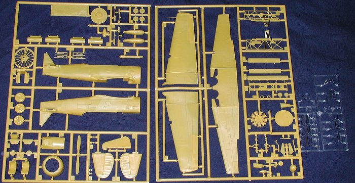 Molded in alovely yellow plastic, the Ocidental kit at first glance seems to be based onthe Monogram kit. However, it is a new tool and only superficially similar.After all, there are only so many ways of designing a kit! Unlike the Monogramversion, this one has fully engraved panel lines, a goodly selection ofunderwing ordnance and separate canopy sections. The interior is very nicelydone giving a full floor and side detailing. You also get both types of canopysections; those with and without extra bracing.