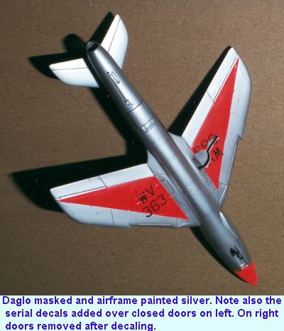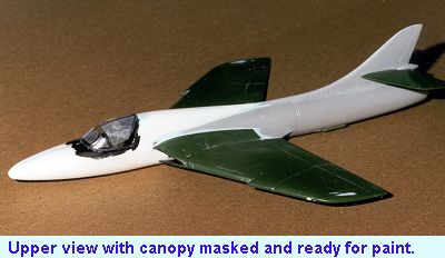 Next the main gear doors were attached in the closed position with white glue in preparation for painting and decaling. In addition to needing to be closed for the paint scheme, Hunter underwing serials covered the gear doors, so the doors have to be closed for decal application. After the decals are applied and dry, they will be cut and the doors removed. After the doors were closed, the gun bulge on the left side was attached and a barrel made of brass tubing installed. Then the canopy was masked and it was off to the paint shop. You'll note that no underwing pylons will be attached until after painting or they will interfere with the paint scheme.