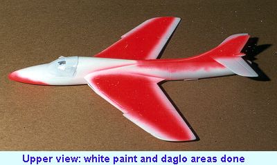 The nose was then attached and the ensuing attachment area smoothed out with several coats of putty. Then the wings were attached and again smoothed out with several coats of putty. Although this sounds very straightforward, it is actually several days worth of fiddling and puttying!! By this time, things are looking up. The tailplanes were then glued on and the result is a semi-complete airframe that actually starts to look like a twin-seat Hunter!