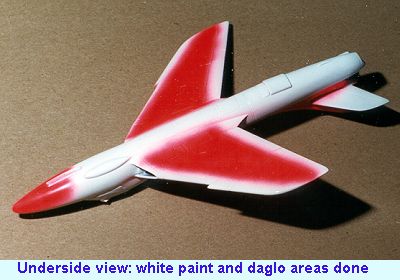 Painting is rather basic. First the entire airframe is painted gloss white, as were the short fuel tanks and inner pylons. This is to provide a nice base for theDay-Glo and the aluminum. After that is dry, the areas of Day-Glo were painted, and this includes the front nose gear door, but not the aft one. I used GunzeDay-Glo and it took a number of coats to get a more or less consistent finish. Once that was dry, the airframe was masked using lo-tak and scotch Magic tape. Then the entire airframe was painted with Testors AluminumMetallizer. Also the outer wing pylons were painted this color.