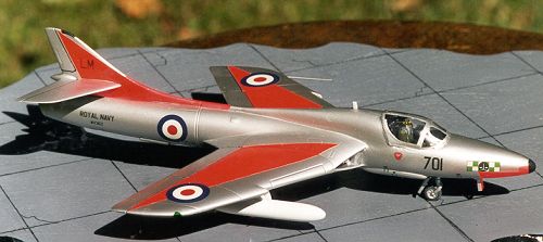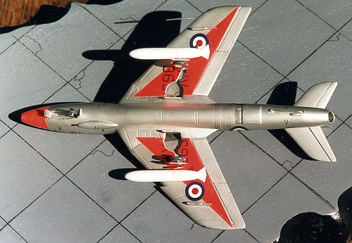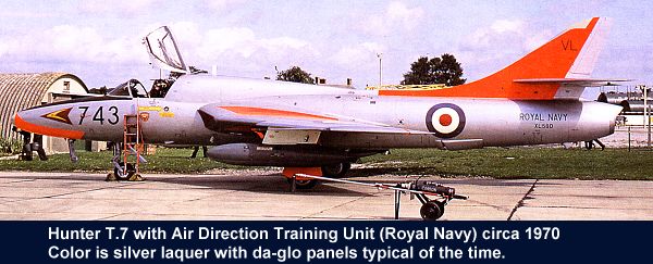 Allowing ample time for all to dry, the masking was removed and attempts were made to touch up any overspray. In this process, I smudged a small area on the fin, which will be repaired at a later date. Next, the entire aircraft was sprayed with Future gloss floor wax. This is done to seal the metallizer and it also dulls it sufficiently to look like aluminum paint instead of bare metal. When that had dried it was time fordecaling.This kit is a representation of a Hunter T.8 (the T.7 is the RAF version) from 764 Sq at Lossiemouth, Scotland in 1964. Modeldecal sheet #28 provided me with the markings I needed. Common markings such as insignia need to come from another source. Application of the decals was no problem, except for the roundels, and they reacted well to all setting solutions including the industrial strength Champ solution. Roundels were a problem. This is because theDay-Glo paint is such an intense color. I used Modeldecal roundels from sheet #47, but the paint still bled through the white areas. Eventually, I had to underlay each of the upper and lower wing roundels with two layers of white decal to get the bleedthrough down to a reasonable level. The next time, I will put the insignia down on the white undercoat, and spray theDay-Glo over it. When the Day-Glo is dry, lightly scribe around the edge of the insignia and remove it with a piece of tape leaving a white area for the finaldecaling. One lives and learns.
