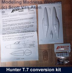 In 1/72 there have been a few Hunters produced. Airfix produced an early version without the 'dogtooth' in the wing followed later by an upgraded kit to FGA.9 standards. Although it has some profile problems in the nose area, it is the best mainline kit to be had in 1/72. Frog also produced an FGA.9, but it is even worse than the early Airfix kit. Back in 1976, Matchbox released its version of the FGA.9 and offered a T.7 as well in the same kit. It also suffers from shape problems, but the worst area is the nose section. Aeroclub has come to the rescue with vacuform replacement noses for both versions. The T.7 conversion was chosen for this article.
