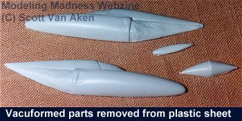 Well the first thing you will notice with the Aeroclub conversion are the vacuform parts. You get two forward fuselage halves, a gun blister and a new nose should you wish to do a T.8M, used to train Sea Harrier FRS.1 pilots how to use the radar system (hence the new nose). Now, to cut out vacuform parts, here is what you do. First, get a good, sharp soft lead pencil. Then draw around the parts to be removed from the backing sheet. Then, taking a hobby knife with a new, sharp blade (the pointed ones work best), score around the parts a couple of times, holding the knife at about a 45 degree angle. Then simply grab the piece and surrounding plastic and bend it. The plastic should snap right off, leaving the part in your hand. The reason for the 45 degree angle is that way you'll have less plastic to sand off.