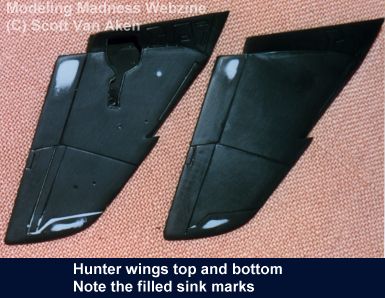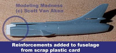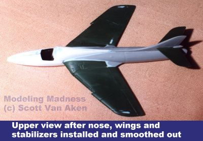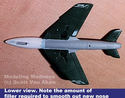 While things are drying on the new nose, you can start on the rest of the airframe. You will notice that this kit is blessed with a number of sink holes on the wings and fuselage that must be filled. Assembly of the wings and fuselage is very straightforward. I painted the fuselage sides and wing intake areas flat black, since there is no detail. After the fuselage is dry, I attached pieces of card to the forward section to provide mating surfaces for the new nose.