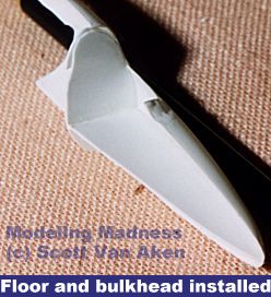 Once the pieces are sanded down enough, then take out the cockpit area; again by scribing it with your knife and snapping away the excess plastic. Next, using the templates given, cut out the floor and bulkhead from scrap plastic sheet. I tape the template to the back of the sheet and then hold it up to the light. Then I make a pencil drawing on the plastic sheet and cut it out using my knife. I'll warn you at this part, that the templates are overlarge and that you will have to file them back to get them to fit. Just remember that it is easier to take off material than to put it back on. Again the key is constant dry fitting. It will seem like a hassle at first, but with practice you'll get very good at it.