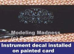 Before fitting the floor and bulkhead into the nose section, it is time to think about the nose wheel well. You have two options. You can build a new one from plastic card, or you can cut one from the kit nose. I chose the kit nose option. I crudely cut out the nose well from the FGA.9 nose and glued it together. When dry, I trimmed it even more then fit it where it should be using the kit T.7 nose for a guide. Then I installed the floor and bulkead in one half; again trimming and dry fitting all the time. Once those are installed, paint a piece of plastic card flat black and when dry, attach the kit instrument panel decal. Then fit that into the cockpit. The cockpit should be flat black. Finally install short strips of plastic card around the nose section to act as tabs for the other half to glue to. Install weight in the nose to prevent tail sitting. Then, after the usual dry fitting and adjustments, glue the halves together. That all sounds very simple, and can be, but for me this meant a lot of filing and filling as I am not good with vacuformed plastic. Sorry that there aren't any photos of all this as something always happens and for some reason, I had the shutter speed at 2000 instead of 90; ergo no photos!