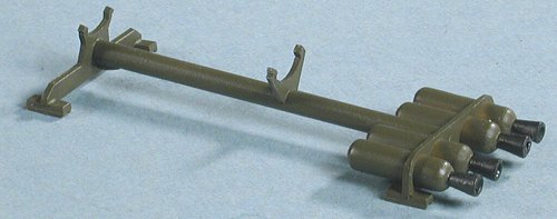Returning to the launch assembly, the JATO bottles were cleaned up and the nozzles were slightly drilled out to give them some depth. Then these were fit into the framework. I had to enlarge the openings somewhat in order to get the bottles to fit. They are a bit fiddly as getting them properly aligned is imperative or it will just look wrong. There are little feet on the end braces which fit on the rails that were also glued in place at this time. When that was dry, the entire assembly was painted Olive Drab using Tamiya acrylics. Perhaps it needed to be a bit more faded, but really, the choice is yours on how this is done.