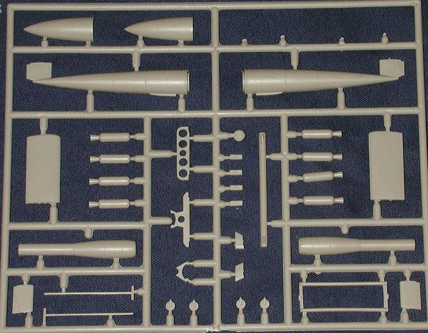 This is exactly the same kit as that which is boxed as the V-1. Difference is the nose cone and decals. This boxing has the more bullet shaped nose without that weird curve that the German version contains. The kit has the proper engine pylon though the engine housings themselves are the same. Though it also includes the German ground handling dolly, this version is supposed to use a launching rack as shown on the box art. The launch assembly uses JATO rocket bottles rather than the compressed air of the V-1.