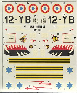 Instructions are typical pictorial construction sequences with colors given with Heller numbers. There is a cross reference sheet provided, something that I wish modern Heller kits supplied. Markings are for two aircraft. One is the box art plane of the Israeli Air Force with the large shark mouth and painted in desert colors. The instructions show that mixing of these colors is needed. The other is a French version from EC 1/12 at Cambrai in 1954 with lots of red on the nose and tail section. The majority of the plane is bare metal. Decals are well printed and matte. Generally they work quite well and do succumb to setting solutions.