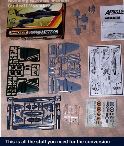 In kit form, the Meteor can be found in 1/72 as an F.3 from Airfix, F.4 from Frog/Novo, F.8 from Merlin and Rareplane, NF.11/12/14 from Matchbox, and NF.14 from Rareplane. There have also been conversion kits to do other marks including a T.7 from Airmodel and Aeroclub's four conversions for the Matchbox kit; F.8, FR.9, FR.10 and the subject of this conversion, the T.7.