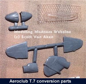 Aeroclub's conversions are really quite straightforward. One is provided with the necessary parts in short run plastic as well as a vacuform canopy. Those parts can be a nose, tail unit, cockpit housing or white metal ejector seat. In most cases it is a combination of parts. For the T.7 you get a new nose, tail unit and canopy. The wings must be shortened in span, and a template is given to help you accomplish that. Other than the wing, the only cutting required is that the nose be cut off the NF.11 fuselage. Aeromaster's plastic parts are thick and a bit crude, requiring careful cleanup and fitting, but are perfect for those with vacuphobia (fear of vacuformed parts).