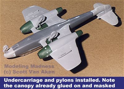 Next the wing pylons were glued on as were the nose gear doors and the various antenna. This aircraft was to be done as a hack with an Australian squadron. That meant a scheme of overall silver paint and not bare metal, the clear overcoating of Testors Metallizer Aluminum would give the right color. However, there are a few bits of red on the scheme that require those parts to be undercoated with white so a part of the tail and wing tips were first painted white and then red. When dry, they were masked off and the rest of the airframe painted aluminum. Finally the aluminum airframe was sprayed with Future to dull it and make it look like aluminum paint.