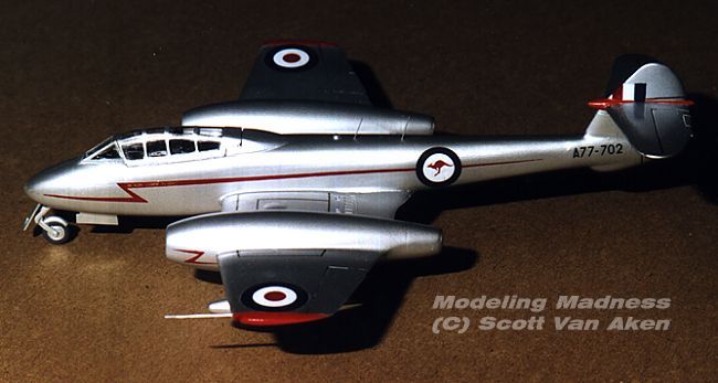 Next the tires were painted grey and the kit was ready for decals. From a good friend, Ken Bowes, came Tasman Decals sheet #V7207 which includes a Meteor T.7 from 38 Sq Communications flight, RAAF. It does not have the RAF-type yellow trainer bands, but does have a very nice red flash that runs the length of the fuselage.