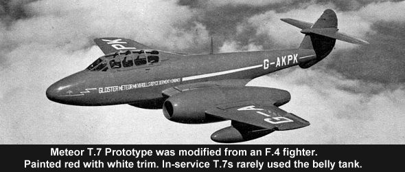 The T.7 is basically an F.4 airframe that was stretched to accommodate an additional seat. T.7s were used by both the RAF and the Royal Navy as well as those air forces who bought the Meteor, including Australia, Israel, Egypt, Syria, Argentina, Belgium, and France, to name a few.
