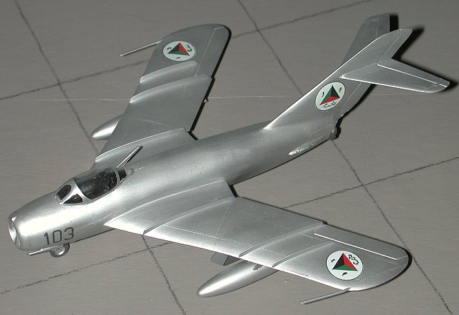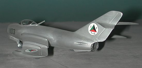 What I did, was to first apply the decals to theusual six positions on the airframe. Then using a fine felt-tipped pen, Icarefully copied the Arabic as best as I could. It is actually quite convincingand no one has yet caught on to the fact that they are not part of the decal!The nose letters came from one of the many KP kits of Russian jets that theyhave done.
