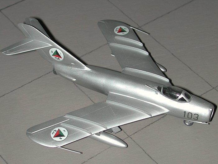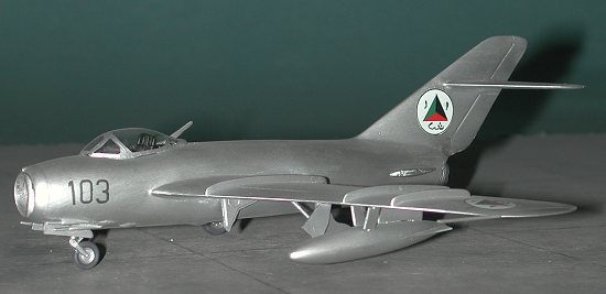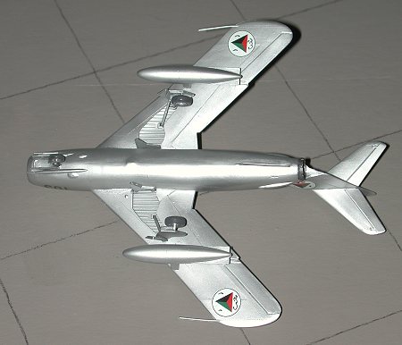 It seems like mostexport Mig-17s were in natural metal. Though many were later camouflaged, theyall started life in bare metal. When I built this kit in the early 1980s, Iwasn't real concerned about getting a multi-hued paint job. Breaking out theTestors Metallizer, I proceeded to give the entire kit a good coat of the stuff.