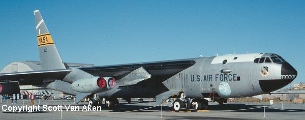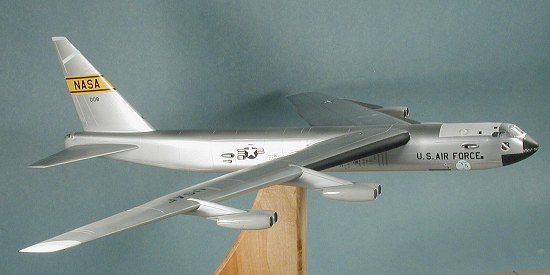 Once that was done, the two resin nose halves, the fin, the tail piece, canopy, and the new right side flap were cut away from their resin backings and cleaned up for use. I found the canopy to With the fuselage somewhat truncated, the section for the landing gear was glued into one of the halves and the two fuselage halves were mated together. It is important that a small piece of the fuselage stiffener sticks out just a bit as it will help align the new nose. With the fuselage together, the tail section and front piece was test fit to make sure that it would fit when the time comes. With the fuselage dry, the kit fin was cut off in preparation for the new one. Meanwhile, I glued together the horizontal stabilizers and the wing halves. On the wings, I installed the separate flaps in the up position. To do so, you need to cut away the flap tracks. The fit is fairly good, though I noticed a LOT of sink areas on the wings that will have to be filled and sanded smooth. The NB-52s were the only B-52s authorized to land and take off without flaps. The reason is that they were usually carrying something when flying and that did not allow for flap usage. Even when 'empty', the large cutout in the right flap would have made for some rather unusual asymmetrical landing characteristics. With the miles of dry lake to land and take off from, flaps really were not needed. Of the many photos I've seen of this plane, I don't ever recall seeing one with the flaps extended. Back at the fuselage I started to glue on the various bits. First I attached the new nose. Fit is pretty good though the usual filler was used. Make sure that the interior is placed into the new nose before gluing the halves together or it will be just that more difficult. I had to cut back the interior a bit to fit the nose as the very tip of it is solid in the replacement. I also glued in the new tail piece. I apparently cut the old tail off a tad short as the new one was a bit smaller, but no problem that sanding and filler can't cure! Since this was to be an 'in flight' model, I glued the gear doors in place. These are basically too small to fit properly. It isn't something that is a problem with gear down, but is very noticeable with gear up. It took many applications of filler to get them to come up to the fuselage. Now that the fuselage was doing well, I started attaching flying surfaces. Starting at the back, the two horizontal stabilizers were glued in place. No muss, no fuss. I then went to put in the right wing. The resin tab is a bit too long so that was trimmed a touch to get the wing to slot in properly. It was a bit of a tight fit, but fit was quite good. As much as I'd have liked to add the proper curve to the wing to denote the flight load, I just left things the way they were. Some filler was needed on the join area. Same with the left wing. I must confess that I'd considered installing the engines and pylons before gluing the wings in place, but figured it would be easier to do things this way. The next thing was to install the cockpit canopy. I painted the interior flat black and then started to trim the canopy. Now I'm not exactly sure what the deal is with the canopy, but it remained 'sticky' throughout construction. I even cleaned it off as best I could with soapy water, but that only seemed to cloud it up and it still wanted to retain finger prints where I held it. Not much left to do since I'm not using the landing gear or any of the very large weapons sprue. The engine pylons were glued in place and provided no problems. By this time I had something that looked very much like a B-52, though sans engines. Speaking of engines, these were removed from their resin pour stubs. Now I must confess that I'm not at all good at removing things so that the area is perfectly flat. Even during sanding I can't seem to do a proper job of things. I do wish that there was some sort of easy way to do this without making a mess of things, but in the decade I've been working with resin, I've not been able to master this particular job. Once the engine pods were painted, the Black Magic canopy masks were used and they fit fairly well. CAMOUFLAGE & MARKINGS Once that was on, I sprayed on several coats of Alclad II aluminum. With that dry, I knew I could mask without having to worry about the underlying paint coming up. Basically there are areas of black and white that need to be done and the instructions show you where that is needed. I also used the photo at the bottom of the page that I took in 1989 for a reference. After the kit was painted, I installed the engines. These are butt joins, but a bit of superglue holds things on quite nicely. Anyway, the decals are very thin, so much so that you really need to be careful applying the long ones or they will fold up on themselves, making a real mess. Keep a bowl of clear water handy for 'refloating' these. I also found that I had some fit situations. For instance, the NASA tail band seemed to be too short and I had to place it higher on the fin that I though I should. I also think I got it on crooked. The '0008' for the nose was too tall for the space the kit gives so it overlaps onto the radomes. I also found that there was no lower wing placement guide, and since they definitely won't fit in the same places on the underside without overlapping the pylons, one has to make a guess. Another real help in the conversion instructions would have been a scale drawing for the placement of the camera pods. I found that I had placed some of them where decals were supposed to have gone. Aside from that, they are really superbly done and it is nice to have the additional little black squares for windows. I never did find out where the yellow and red stripes went.
