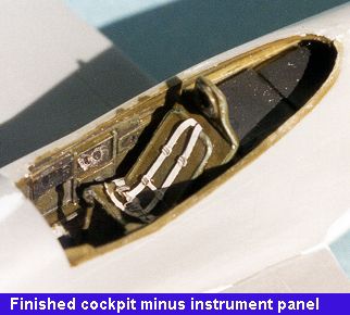 Next the interior and well areas were sprayed with interior green (use your favourite) and the ducting area was sprayed aluminum as were the wheel well doors. You might as well spray other small exterior bits aluminum as well since the aircraft was painted this color overall. Most photos I have seen of this aircraft show them to be painted aluminum and not bare metal. Back in the interior the brass instrument panels were painted black and drybrushed. The instrument film had the back painted white so the dials would show up. These were glued to the back of the instrument panels and the assemblies were then glued to their respective places in the cockpit. Super glue was used for this though you could use 5 minute epoxy as well. The interior parts were then given a dark wash and then a drybrushing.