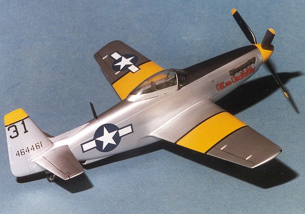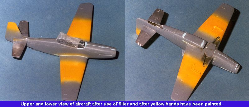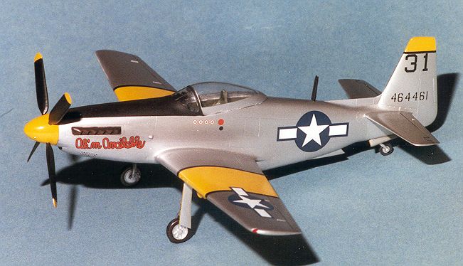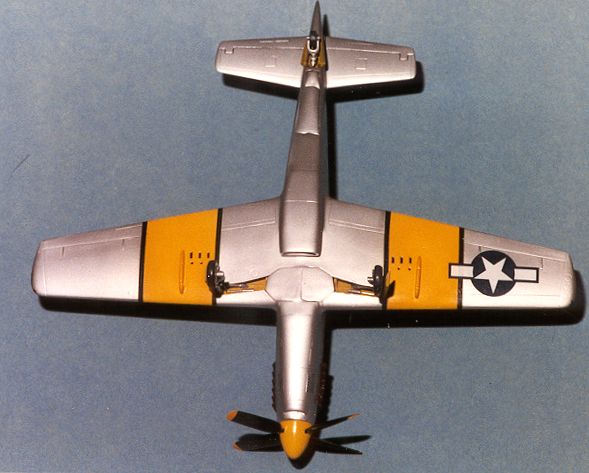 First off, I attached the bomb racks to the bottom of the wing with white glue. Then the tip of the tail and the wings from outboard of the wheel wells to inboard of the ailerons was painted Testors Modelmaster Gloss White. This is because I was going to do a 57 FG aircraft and that area would be painted yellow. I know that the decal sheet has these bands, but I have been warned not to use the decals as they are too small (Thanks, Tom!). Whenever using a translucent paint like yellow, red or light green, it is a good ideal to give it a white undercoat. Once that was dry (and it didn't take long) it was on with the yellow. The prop spinner was also given the white then yellow treatment. Somehow, I put on the yellow a bit too thick and it ran so after it dried, it was sanded down using fine grit sandpaper and repainted. Once the yellow area was masked off, the rest of the airframe was given a thin coat of gloss white in preparation for the silver/aluminum overcoat.