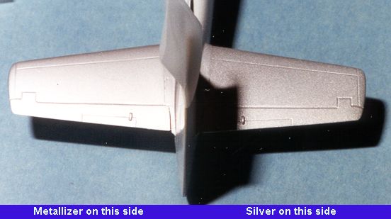 I wasn't really sure if I wanted to use Metallizer aluminum or regular old Testors silver to duplicate the painted aluminum surface. What I did was to do a couple of test bits using the outer wings. One was painted with silver and the other with aluminum. After letting them both dry for a day, I decided to stick with the Metallizer. The Testors silver has too large a 'grain' to be passed off as aluminum paint. Would probably be great for cars, though! Anyway, the canopy was properly masked off with Scotch Magic Tape and the rest of the airframe was painted with aluminum Metallizer. After drying, the anti-glare panel was painted flat black.