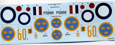 heet. Usual Humbrol-only paint numbers with no clue as to what the shades actually are. This, to me, is a major bad thing that Airfix and other companies do to modelers. The painting and decal placement guide is an equally large full color sheet with markings for each of the two options on either side of the paper. One is the box art plane from 81 Squadron in Malaya in 1954. This basically anonymous plane is in PRU Blue with upper surfaces in Medium Sea Grey. The other is a Swedish plane from 1955 with Flotilla 11. It is in overall PRU Blue. The small decals sheet is superbly done. It looks as good as any aftermarket sheet and hopefully will be in the vanguard of the end of substandard Airfix decals.