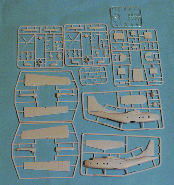 Typical of all the A-model kits I've seen, this one comes on a number of rather smallish sprues of off-white plastic. Molding is actually fairly good with nicely engraved panel lines where needed. Several of the sprues are duplicated as needed. The parts all show a small amount of flash, or you could call it 'extreme mold seams' if you wish. There is what seems to be an additional sprue with the spray tubes included. The clear sprue looks to be fairly well done, though the clear parts all have a number of stress lines in them and aren't crystal clear. However, it should be enough to see the rather complete cockpit section that has seats, sticks and consoles. There is also a rear door to gain access to the cargo bay. This is complete, but empty of any real detail. A few other observations are that the props are not squared and there are some sink areas on a few of the thicker parts. It also seems that the base sprues are the same for all versions. If you want to, and have the decals, you can do just about any standard 123 with the sprues in this kit. The radar nose is there as are the under wing drop tanks and pylons. As short as the wheelbase is on this one, I'd think that nose weight would be in order as well.