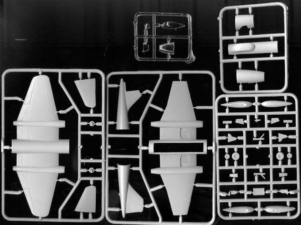 For those who are looking at the box art and wondering if this isn't a PR.9, it isn't. I don't know why the art person has done that, but for the Canberra kit's I've seen from AModel, he's botched the box art on them all. The kit has the proper gun pack, the proper wings with tanks and the nose on this one is clear plastic to take care of the various windows needed for the bombardier/navigator. The interior consists of two seat shapes, and in this scale, that is adequate. The wings and center fuselage are single constructs, with the nose and tail section butting in place. These butt joins may well be the greatest area for error, especially on this aircraft where the canopy is off to one side and not down the centerline. The kit will need at least 10 grams of nose weight so don't forget to add it when constructing the interior. Molding is fairly good, though on my sample, both lower wing tank pieces were quite lumpy with sink areas. The landing gear and doors are also adequate for this scale. Test fitting shows that the lower wing section will need to be sanded to be flush
