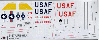 Instructions are well done and use Humbrol paint references. There are markings for two planes. One is a rather non-descript overall unpainted metal version, while the other is an RB-57A with the 10th TRW based in the UK as shown on the box art. The kit instructions imply that the recce version also has a full operating bomb bay with bombs, but I believe that the bomb bay was filled with cameras on the RB-57 version. If it is otherwise, I'd like to hear about it. No camera windows are supplied so the builder is on his own in this regard. Decals are nicely printed and previous experience has shown that they work very well, though are very thin. It would have been nice to have had at least an ANG option for the overall natural metal version as several guard units flew the early Canberra.