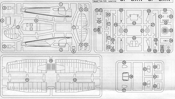 The kit provides four grey and one clear sprue. The clear sprue is nicely molded and while not crystal clear, is not at all badly done. The interior has two front seats, rudder pedals for the pilot, an instrument panel and a control wheel that attaches to the panel. This is, after all, a light plane. There are no seats in the back. A full one-piece upper wing has separate lower sections.