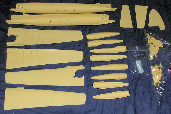 The very long wings were warped, but it is to be expected from long, thin resin moldings like this. The hot water treatment will fix that in no time. There are alignment pin holes for the wings and tail planes; some of which will need drilled out more as they have resin blobs in them. The real improvement in this kit is that the landing gear seem to be reinforced with wire. This is a big plus with all the weight of the resin and what you'll have to put in to prevent tail sitting. You may want to add wire to the axles as well, just in case.