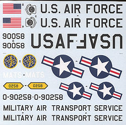 Markings are for one aircraft, a C-124A (49-0258) in generic USAF markings that is now in the process of being restored at the AMC museum at Dover AFB, DE. Apparently it was brought up to near C-124C standards with the radar nose and wing tip heaters. It is in overall unpainted metal with black areas around the engines and in other standard areas. The sheet does not include wing walk areas so you'll have to deal with those from the spares bin or paint those on. The sheet also has some C-17 decals such as the serial and AMC badge.