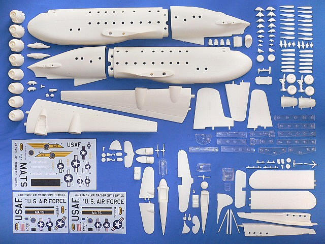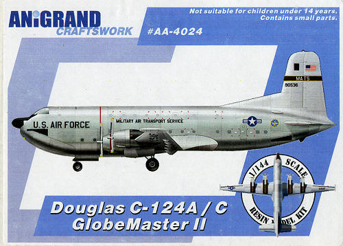 To the delight of many modelers, Anigrand has downsized its huge 1/72 C-124A/C kit to 1/144 scale, a size that fits onto display shelves a lot easier. It is still a large model, but much for of a space saver than it was. I've pinched the parts/decal photo from the Anigrand web site as theirs is so much prettier than how I could arrange it.