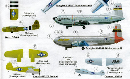 Decal and painting guide is in full color as shown. The C-124C is in MATS markings near the end of its career. The A model has the nice red tail and I'm thinking it might also be able to have red panels on the wings as well. Pretty much generic insignia and serials for the smaller aircraft though I'm sure some research will turn up some more colorful schemes. Especially the UC-78 (I'm thinking 'Songbird').